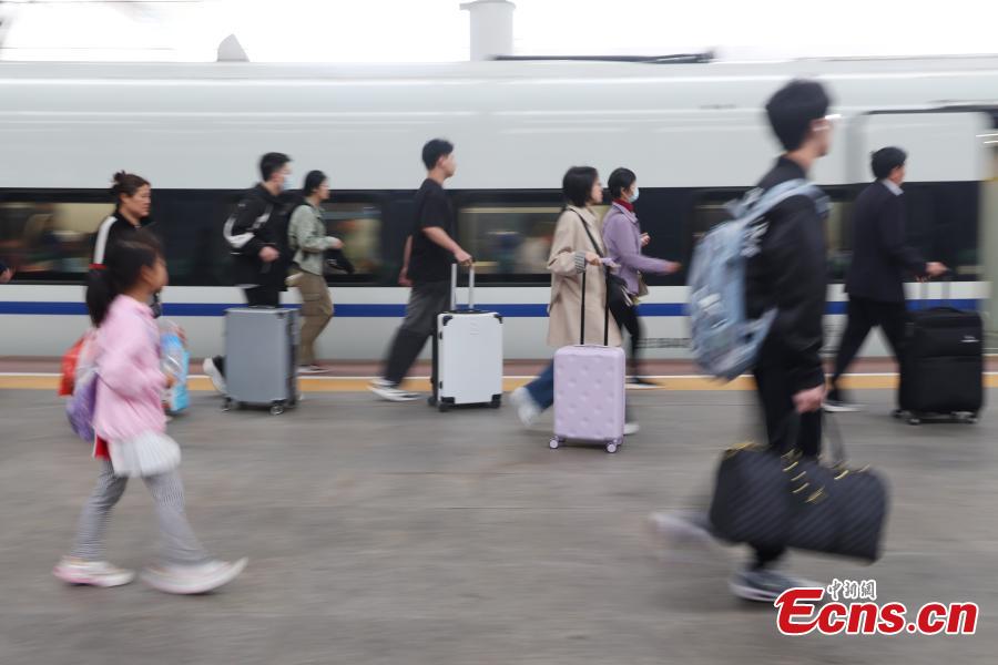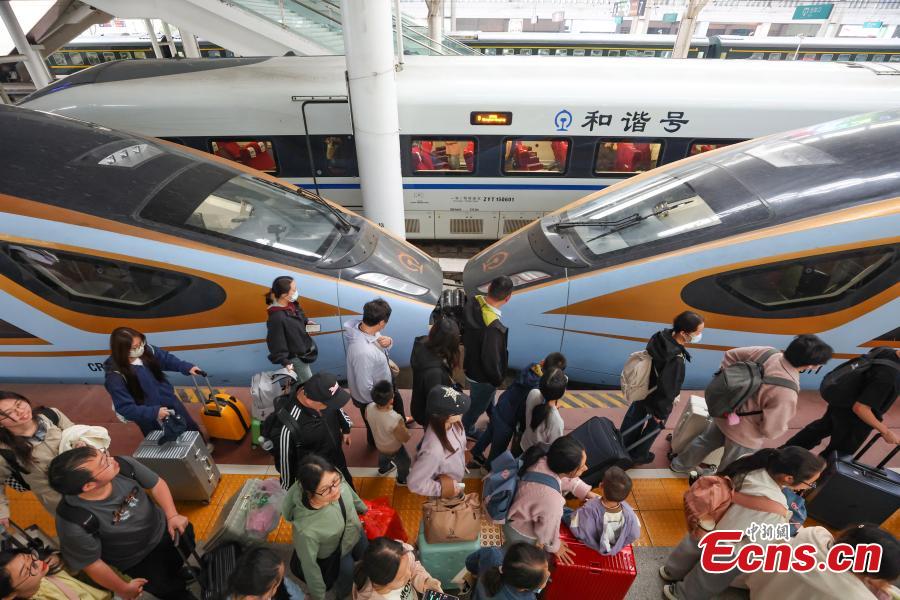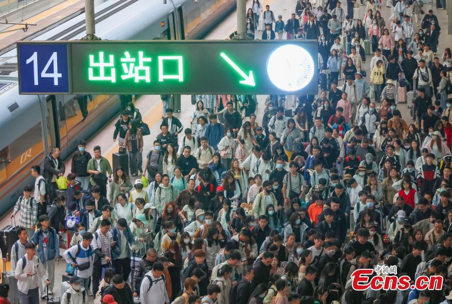 Passengers arrive at Beijing South Railway Station, May 5, 2025. (China News Service/Jia Tianyong)