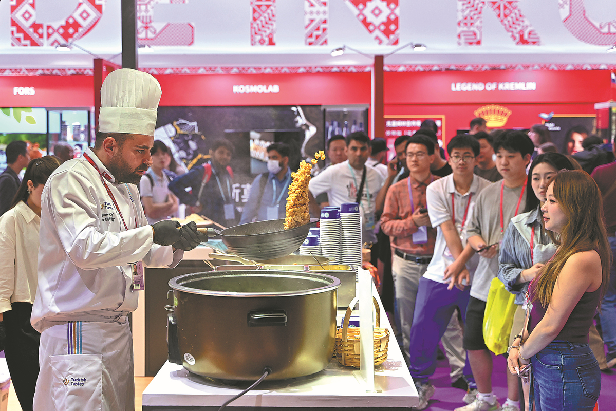 A Turkish exhibitor prepares food for visitors at the 137th China Import and Export Fair, or the Canton Fair, in Guangzhou, Guangdong province, on Friday. The spring edition of the biannual event attracted over 288,900 overseas buyers. (Chen Jimin/China News Service)
