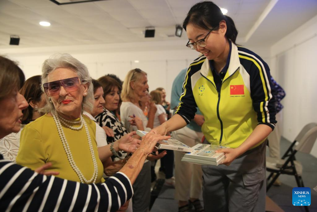 Tang Limei, a member of the 20th Chinese medical team for Malta, gives a lecture on Baduanjin, a traditional form of Chinese aerobic exercise known for its health benefits, in Swieqi, Malta, on May 6, 2025. The 20th Chinese medical team from the Mediterranean Regional Centre for Traditional Chinese Medicine (MRCTCM) provided free clinical services to residents at the Swieqi Local Council in eastern Malta on Tuesday. (Xinhua/Chen Wenxian)