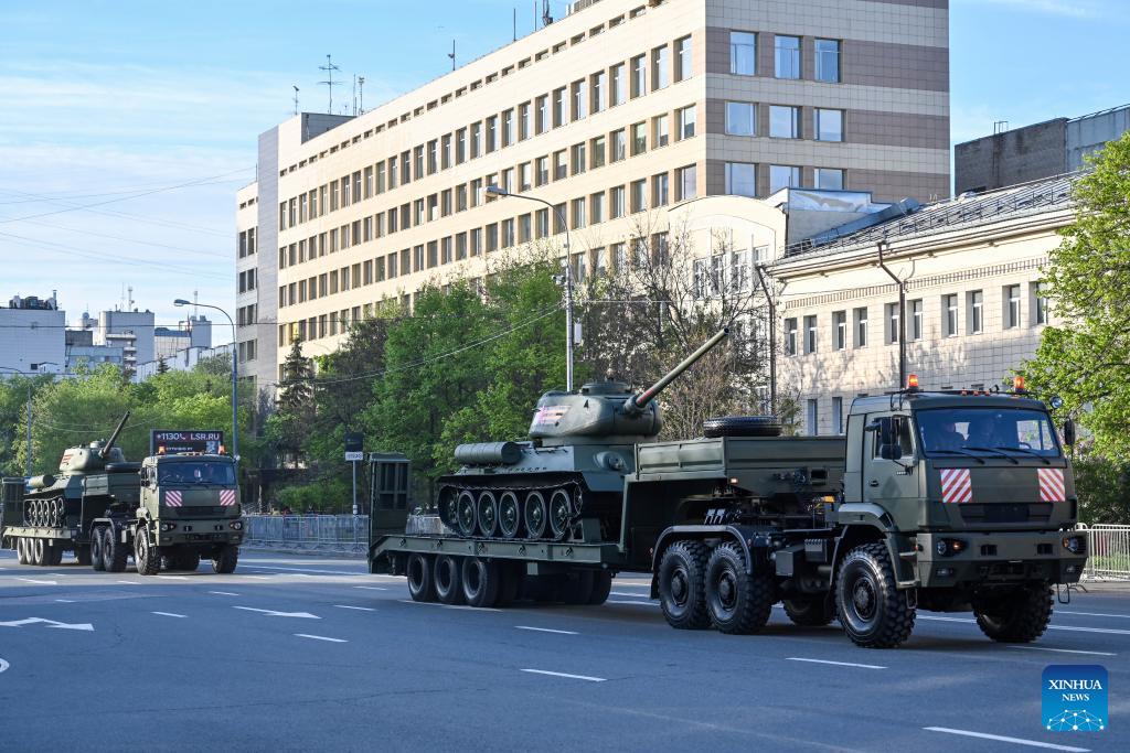 Vehicles drive through the downtown to attend a rehearsal for the Victory Day military parade, which marks the 80th anniversary of the Victory in the Soviet Union's Great Patriotic War, in Moscow, Russia, May 7, 2025. (Xinhua/Cao Yang)