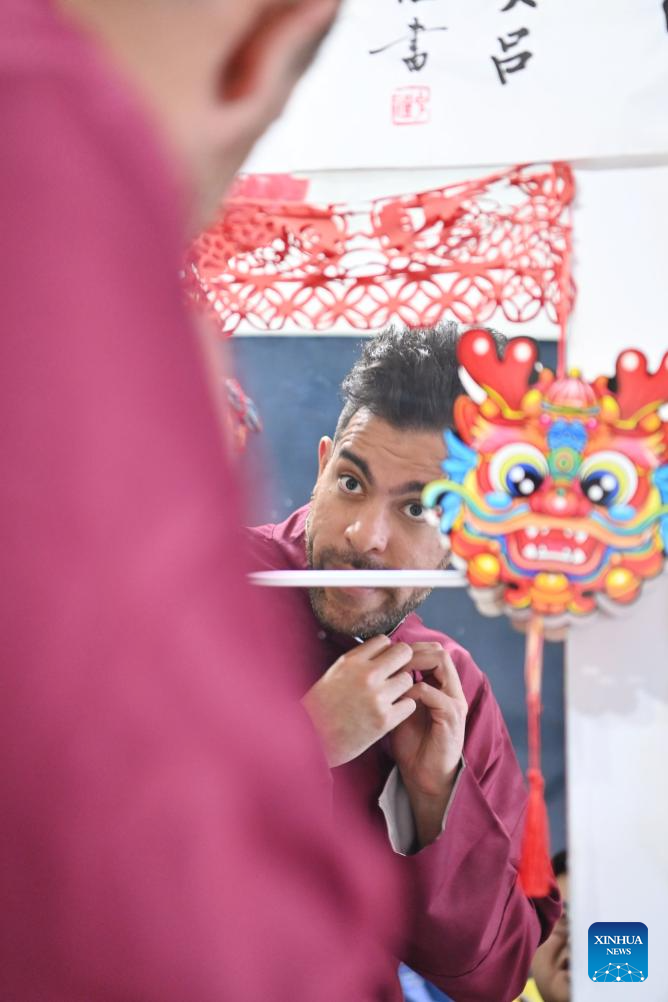 Raydis Franco tries costumes for Tianjin cross-talk at his home in north China's Tianjin, April 25, 2025. (Xinhua/Li Ran)