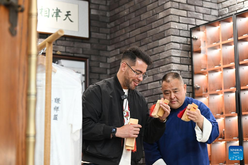 Cross-talk performer Wang Wenshui (R) teaches Raydis Franco to play kuaiban, a form of Chinese storytelling accompanied by bamboo clappers, at a tea house in Hongqiao District of north China's Tianjin, April 24, 2025. (Xinhua/Li Ran)