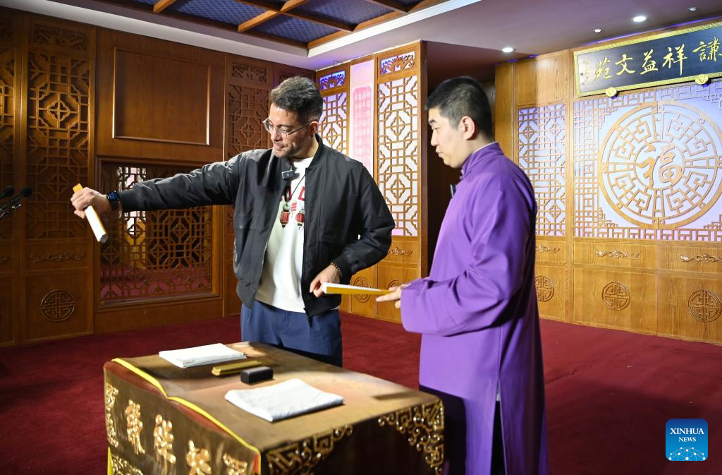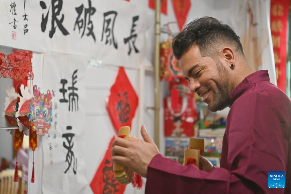 Raydis Franco practices kuaiban, a form of Chinese storytelling accompanied by bamboo clappers, at his home in north China's Tianjin, April 25, 2025. (Xinhua/Li Ran)