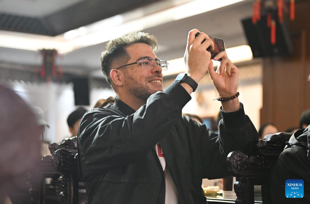 Raydis Franco watches cross-talk performance at a tea house in Hongqiao District of north China's Tianjin, April 24, 2025. (Xinhua/Li Ran)