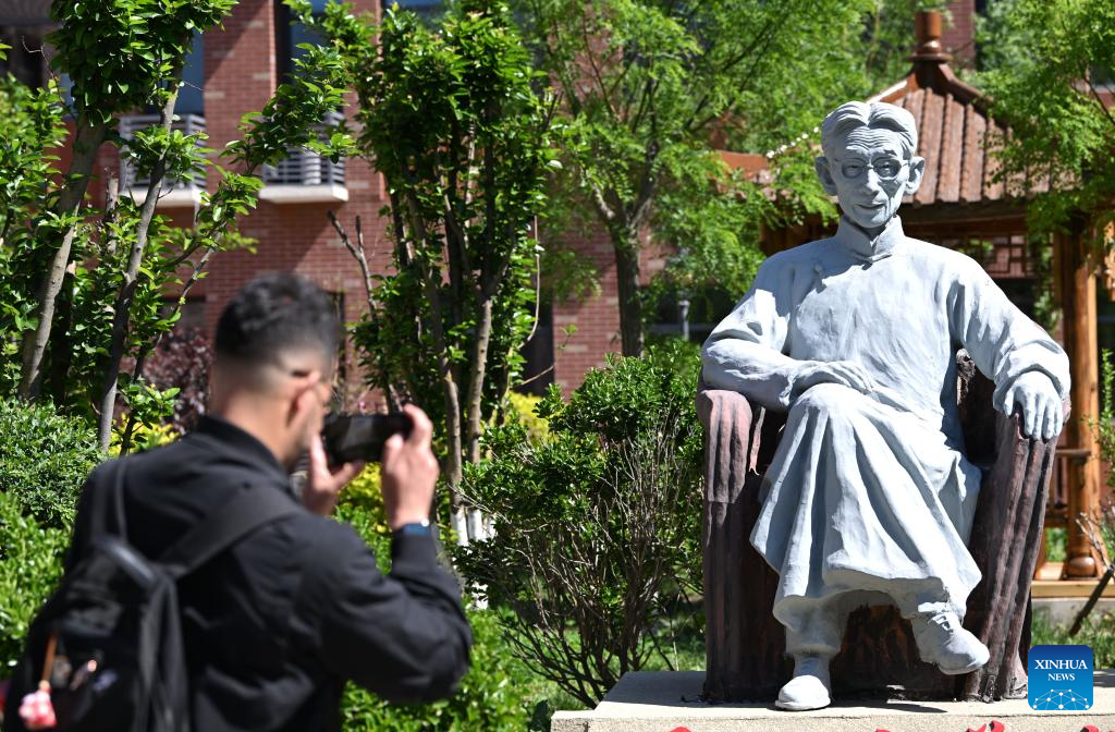 Raydis Franco takes photos of the statue of Ma Sanli, a renowned cross-talk performer, in Dongli District of north China's Tianjin, April 24, 2025. (Xinhua/Li Ran)