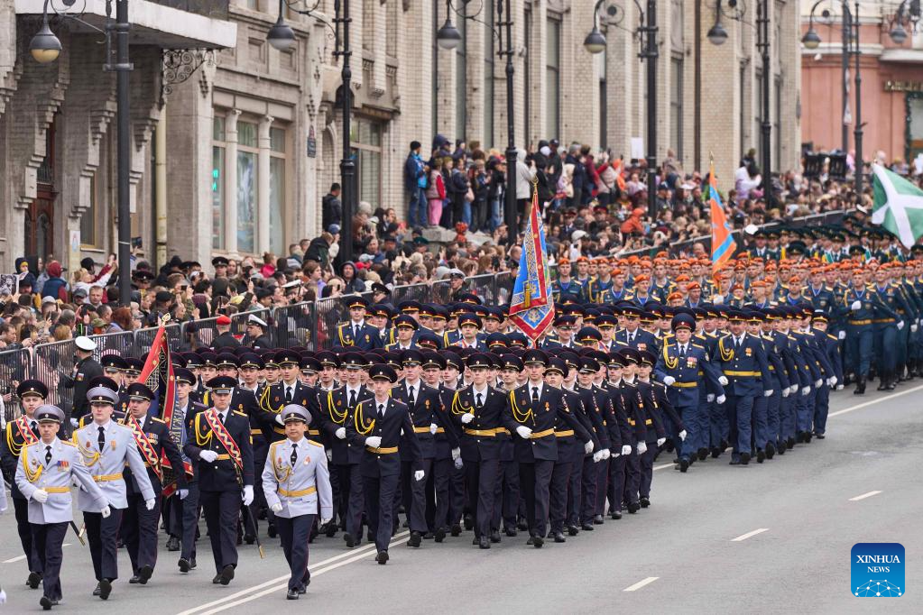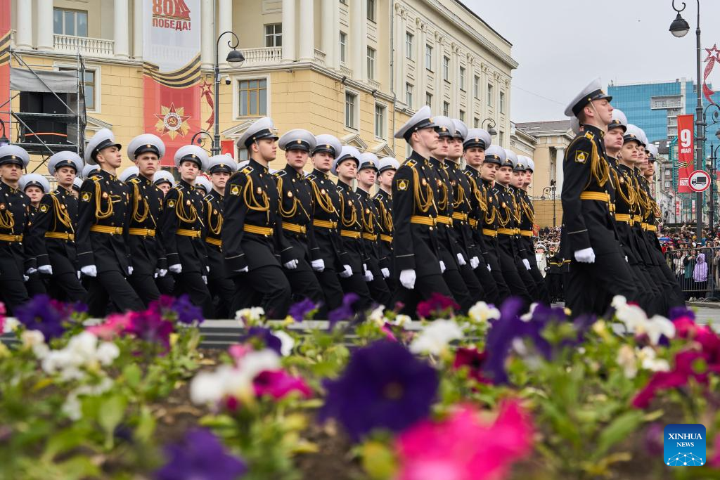Servicemen marching in formation are pictured during a military parade to commemorate the 80th anniversary of the Victory in the Great Patriotic War in Vladivostok, Russia, May 9, 2025. (Photo by Guo Feizhou/Xinhua)