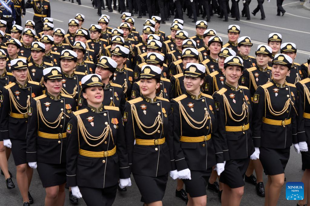 Servicewomen marching in formation are pictured during a military parade to commemorate the 80th anniversary of the Victory in the Great Patriotic War in Vladivostok, Russia, May 9, 2025. (Photo by Guo Feizhou/Xinhua)