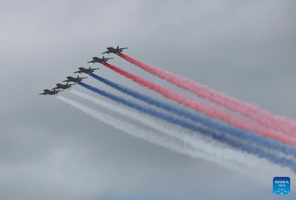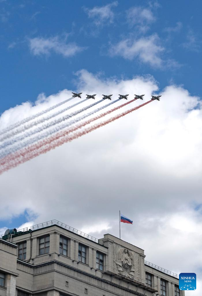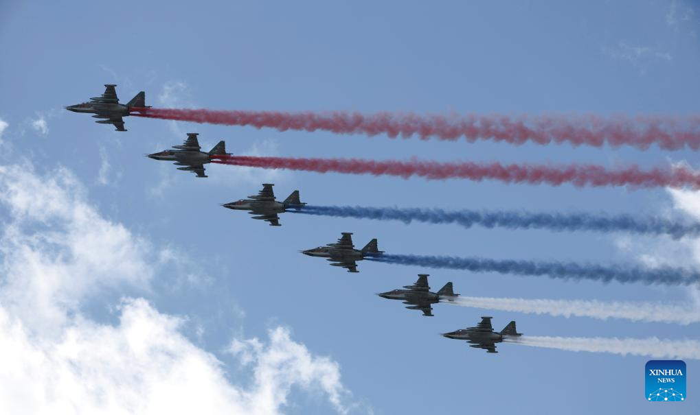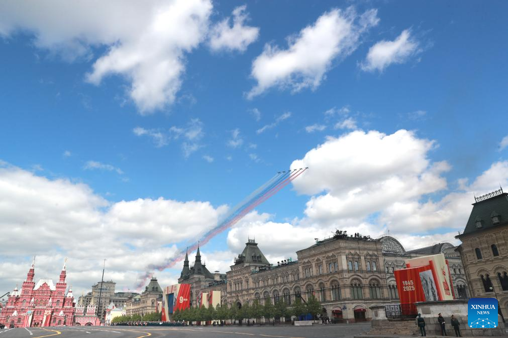 Aircraft fly in formation during a grand parade marking the 80th anniversary of the victory in the Soviet Union's Great Patriotic War in Moscow, Russia, May 9, 2025. (Xinhua/Lai Xiangdong)