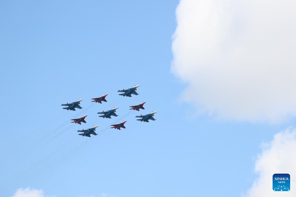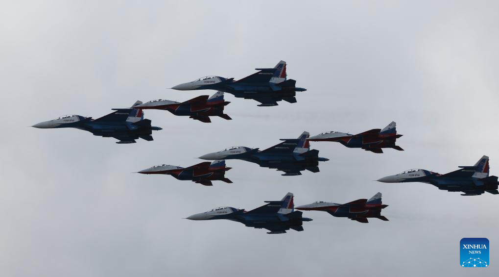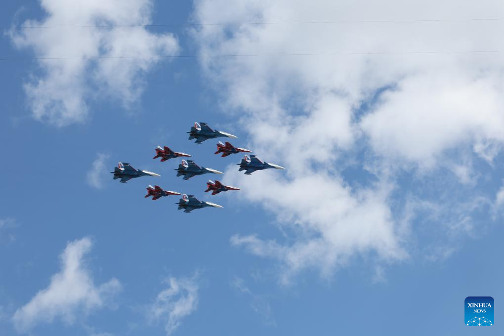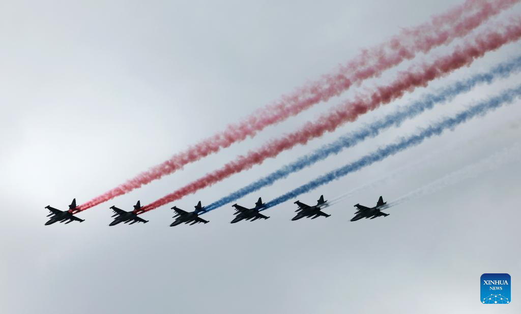 Aircraft fly in formation during a grand parade marking the 80th anniversary of the victory in the Soviet Union's Great Patriotic War in Moscow, Russia, May 9, 2025. (Xinhua/Zhang Ling)
