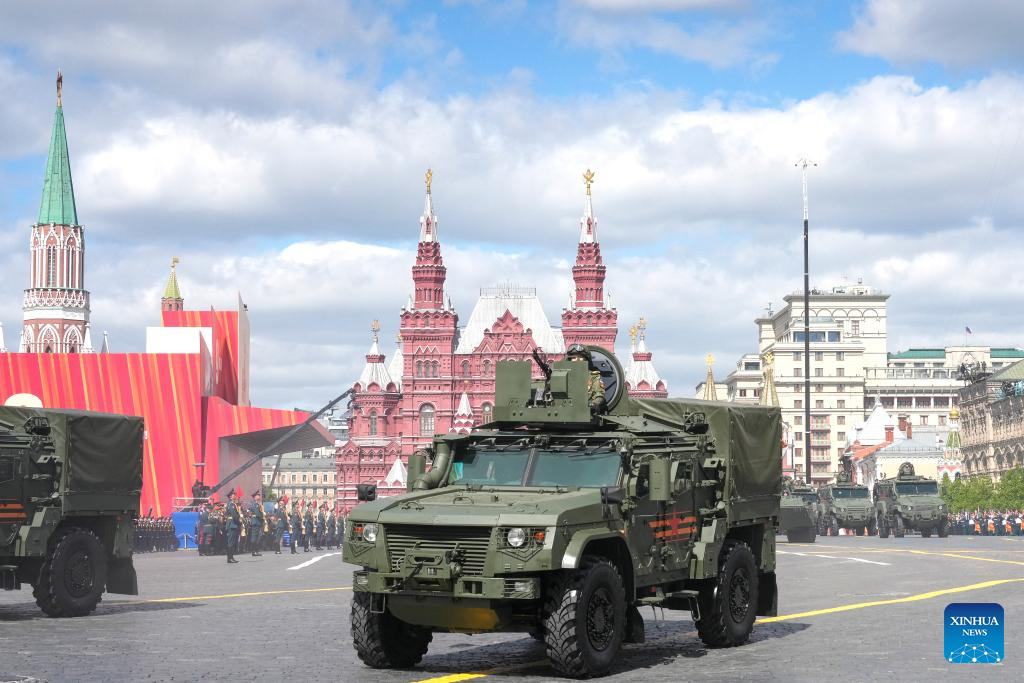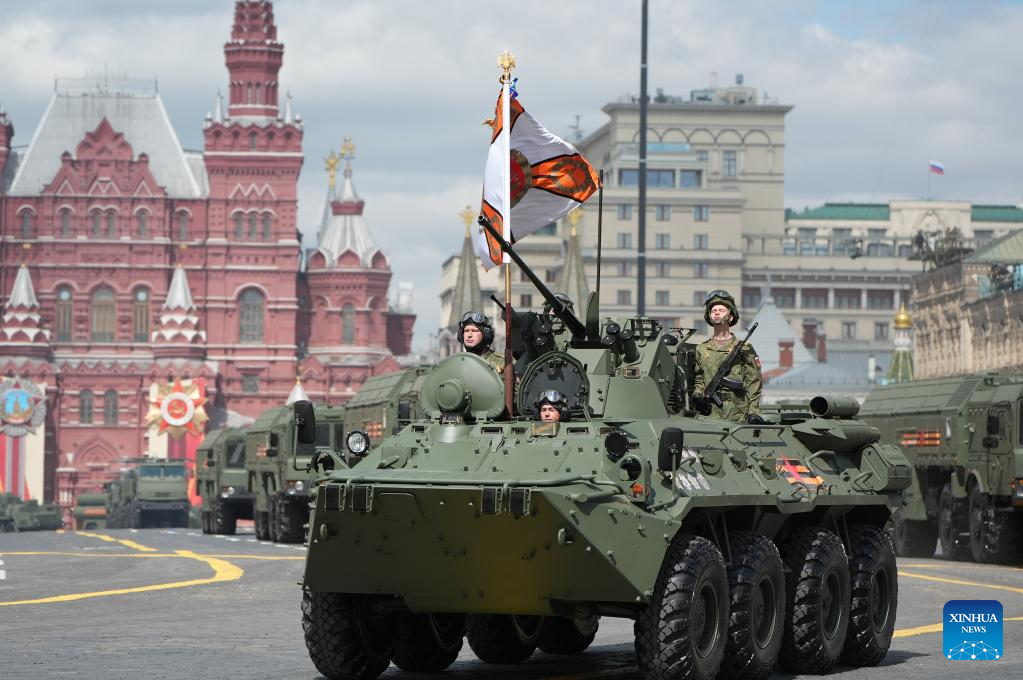 Armored vehicles march during a grand parade marking the 80th anniversary of the victory in the Soviet Union's Great Patriotic War in Moscow, Russia, May 9, 2025. (Xinhua/Bai Xueqi)