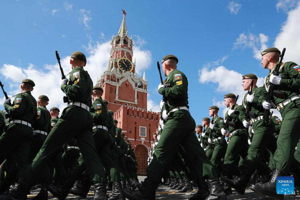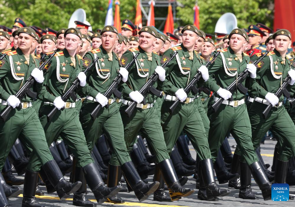 Soldiers march during a grand parade marking the 80th anniversary of the victory in the Soviet Union's Great Patriotic War in Moscow, Russia, May 9, 2025. (Xinhua/Lai Xiangdong)