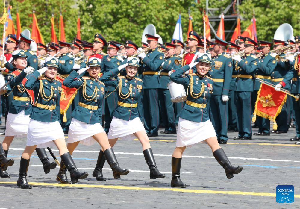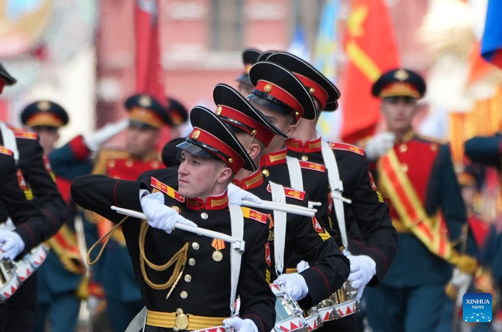 A military band marches during a grand parade marking the 80th anniversary of the victory in the Soviet Union's Great Patriotic War in Moscow, Russia, May 9, 2025. (Xinhua/Lai Xiangdong)