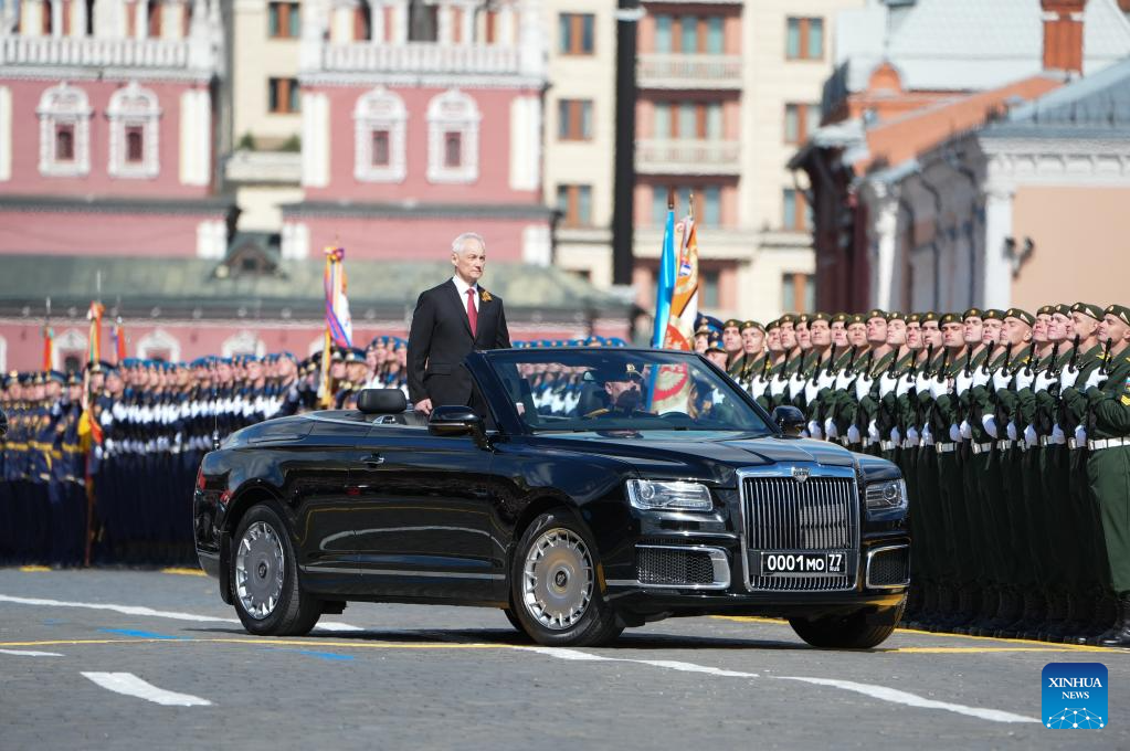 Russian Defense Minister Andrei Belousov prepares to review the troops during a grand parade marking the 80th anniversary of the victory in the Soviet Union's Great Patriotic War in Moscow, Russia, May 9, 2025. (Xinhua/Lai Xiangdong)
