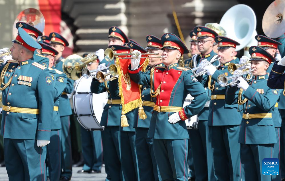 A military band prepares to attend a grand parade marking the 80th anniversary of the victory in the Soviet Union's Great Patriotic War in Moscow, Russia, May 9, 2025. (Xinhua/Lai Xiangdong)