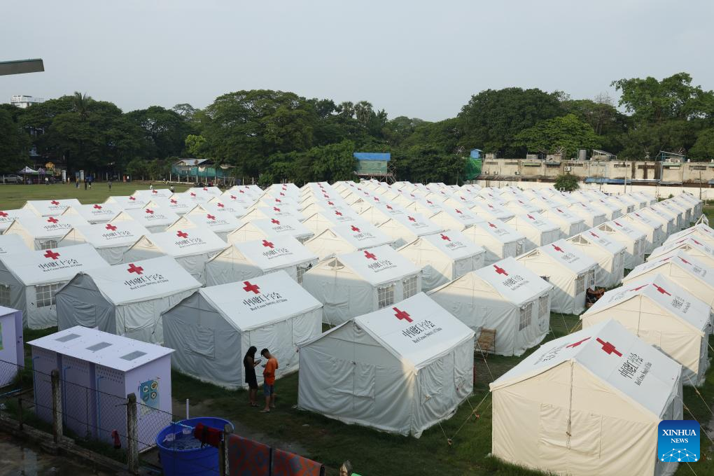 This photo taken on May 10, 2025 shows China-donated tents in a relief shelter in Mandalay, Myanmar. (Xinhua/Myo Kyaw Soe)