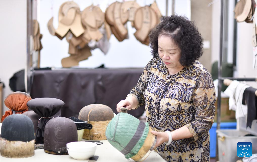 Ma Wanlan, an inheritor of Shengxifu hat making technique, makes a hat at a Shengxifu workshop in Beijing, capital of China, May 4, 2025.
