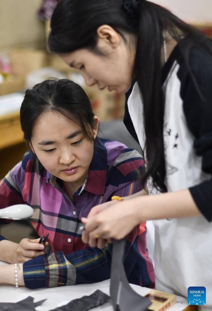 Li Jinshan (2nd R), an inheritor of Shengxifu hat making technique, teaches young technicians hat making skills at a Shengxifu workshop in Beijing, capital of China, April 22, 2025.