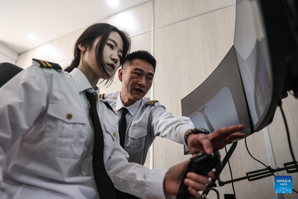A trainee takes a practical drone training session at an enterprise in Shenbei New District, in Shenyang, northeast China's Liaoning Province, April 25, 2025.