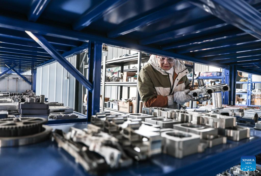 An engineer checks inventory of drone components at a workshop of Faku Zhong Jun Yi UAV Technology Co., Ltd. in Faku County, in Shenyang, northeast China's Liaoning Province, April 25, 2025.