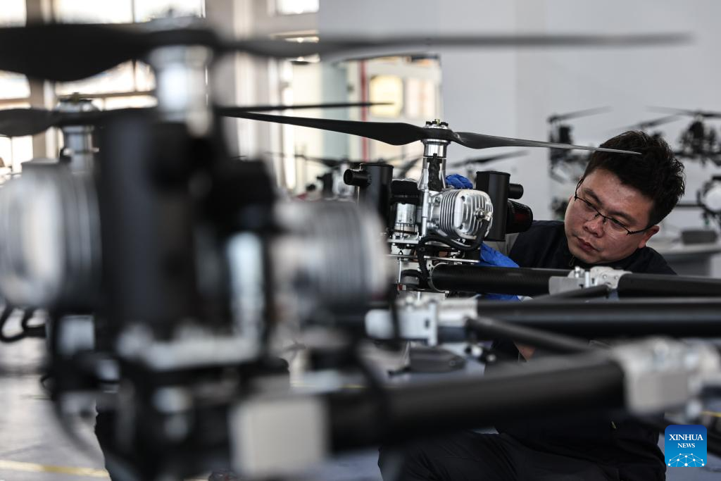 An engineer assembles an unmanned helicopter at a workshop of FaKu Zhong Jun Yi UAV Technology Co., Ltd. in Faku County, in Shenyang, northeast China's Liaoning Province, April 25, 2025.