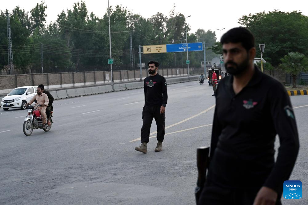 Security personnel patrol on a road leading to Nur Khan Air Base following Indian missile strike in Rawalpindi, Pakistan, May 10, 2025.India launched missile and drone strikes in multiple areas of Pakistan, including three airbases of the Pakistan Air Force (PAF), and also resorted to unprovoked firing along the international border in eastern Punjab province, Pakistani officials and sources confirmed in the wee hours of Saturday. (Xinhua/Ahmad Kamal)