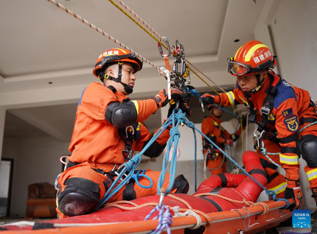 Firefighters participate in an earthquake disaster rescue drill in Longyan City, southeast China's Fujian Province, May 8, 2025. China observes the National Disaster Prevention and Reduction Day on May 12 each year. Various publicity, drill and training activities are carried out across China to improve public awareness in scientific disaster prevention and self-rescue. (Photo by Zhou Yangdong/Xinhua)