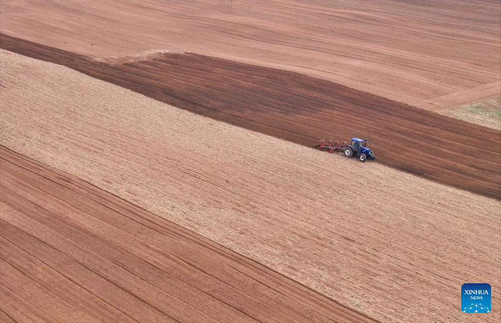 An aerial drone photo taken on May 9, 2025 shows a farmer operating a tractor equipped with Beidou navigation system for plowing in Horqin Left Wing Rear Banner of Tongliao City, north China's Inner Mongolia Autonomous Region. (Xinhua/Lian Zhen)
