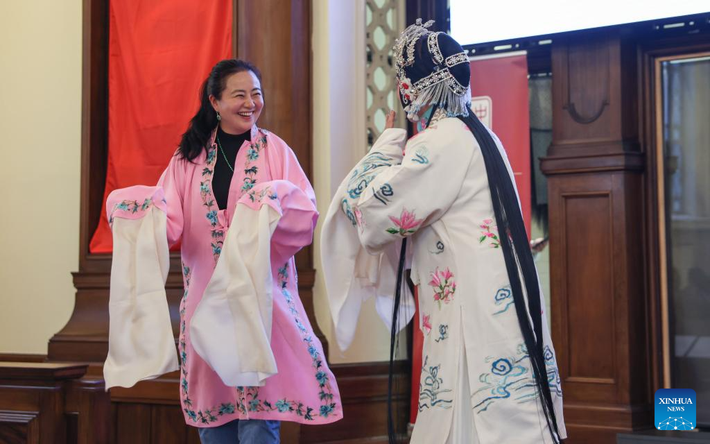 A lady experiences the art of Peking Opera during a Peking Opera salon in Auckland, New Zealand, May 10, 2025. The 2025 "Knowing Hubei, Echoes of Peking Opera Around the World" Peking Opera Gala was staged at the Civic Theater in New Zealand's largest city Auckland on Friday evening, receiving an enthusiastic response from local audiences.