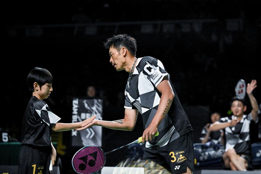 Lin Dan (R1) encourages a young player in an exhibition match, May 10, 2025. (Xinhua/Feng Kaihua)