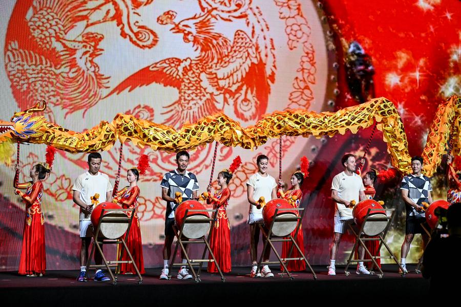 The five badminton legends beat the drums at the "Legends' Vision World Tour", May 10, 2025. (Xinhua/Feng Kaihua)