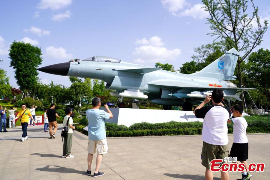 Visitors view fighter jets displayed at Chengfei Aviation Theme Education Base in Chengdu, southwest China's Sichuan Province, May 10, 2025. (China News Service/Lyu Yang)