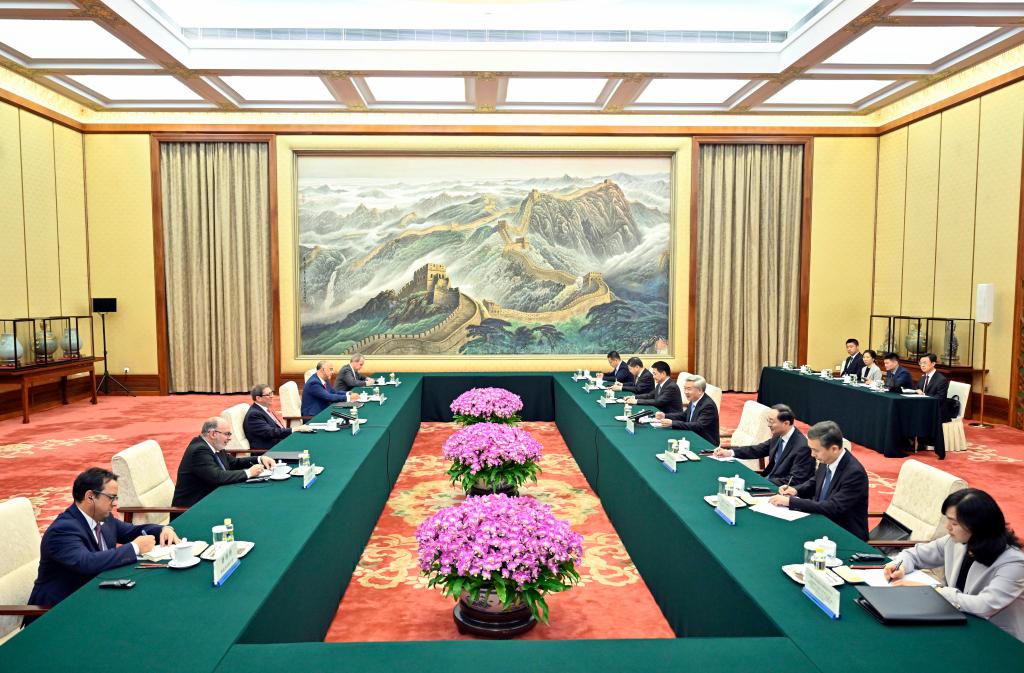 Li Xi, a member of the Standing Committee of the Political Bureau of the Communist Party of China (CPC) Central Committee and secretary of the CPC Central Commission for Discipline Inspection, meets with Cuban Minister of Foreign Affairs Bruno Rodriguez Parrilla, who is here to attend the fourth ministerial meeting of the China-CELAC (Community of Latin American and Caribbean States) Forum, in Beijing, capital of China, May 12, 2025. (Xinhua/Yin Bogu)