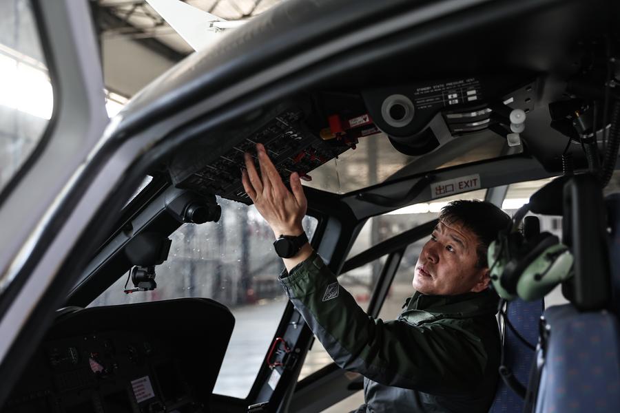 The general manager of Liaoning Tongfei General Aviation Co., Ltd. checks a helicopter for emergency rescue operations, aerial photography and aerial surveying at a hangar in Faku County, in Shenyang, northeast China's Liaoning Province, April 25, 2025. (Xinhua/Pan Yulong)