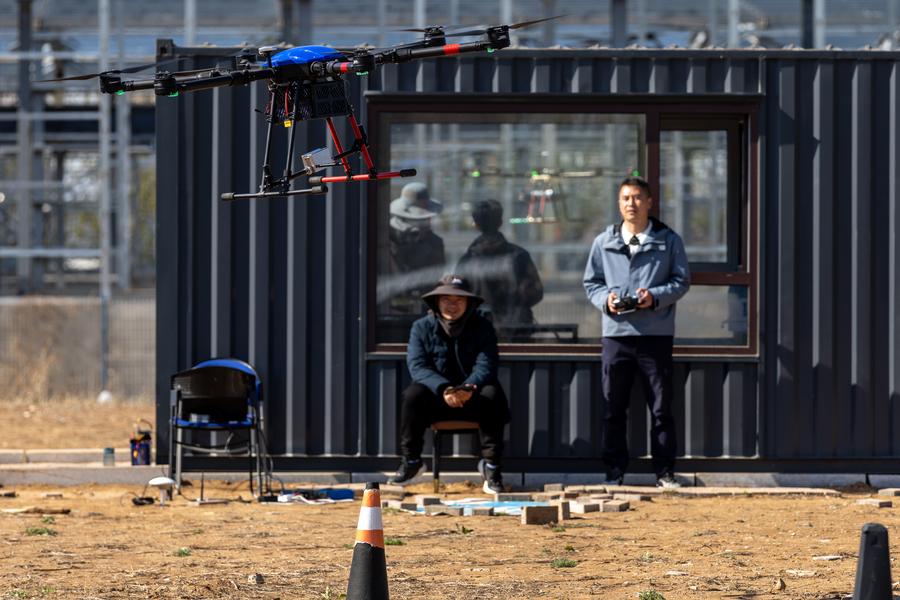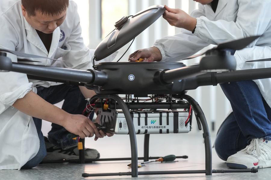 Researchers install an ultra-low-temperature high-energy-density lithium battery on a drone in Dalian, northeast China's Liaoning Province, March 21, 2025. (Xinhua/Pan Yulong)