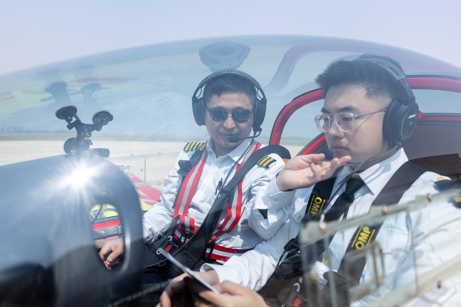 A trainee (R) attends a light sport aircraft flight training session at Liaoning Zhongzhi Yisheng Aviation Flight Academy in Faku County, in Shenyang, northeast China's Liaoning Province, April 26, 2025. (Xinhua/Chu Jiayin)