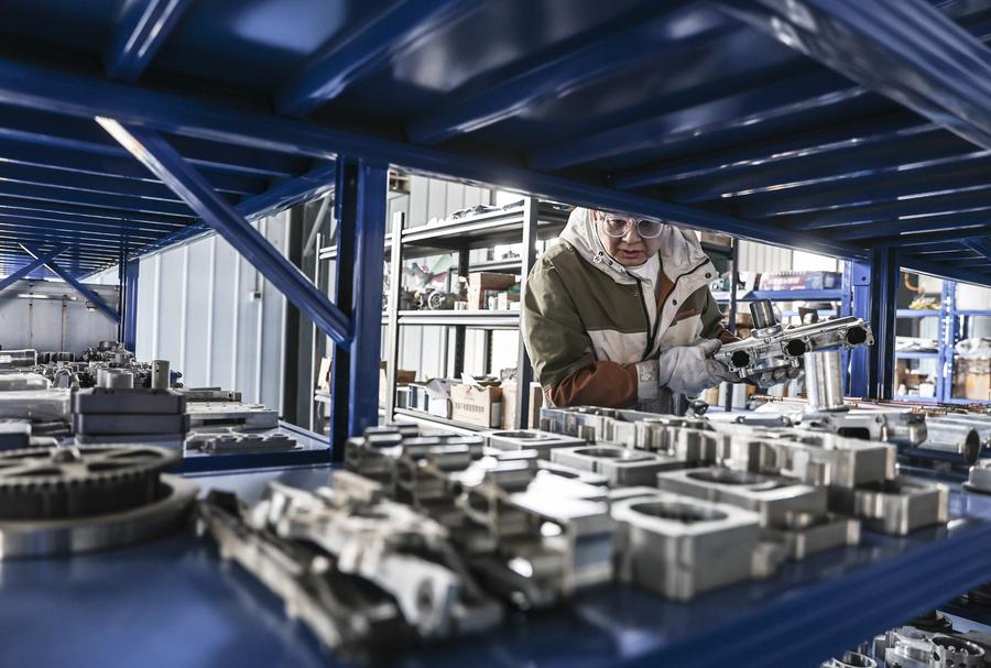 An engineer checks inventory of drone components at a workshop of Faku Zhong Jun Yi UAV Technology Co., Ltd. in Faku County, in Shenyang, northeast China's Liaoning Province, April 25, 2025. (Xinhua/Pan Yulong)
