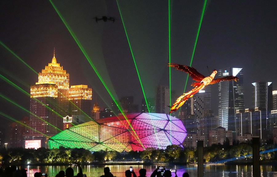 This photo taken on Oct. 7, 2024 shows a drone performance in Shenyang, northeast China's Liaoning Province. (Xinhua/Li Gang)