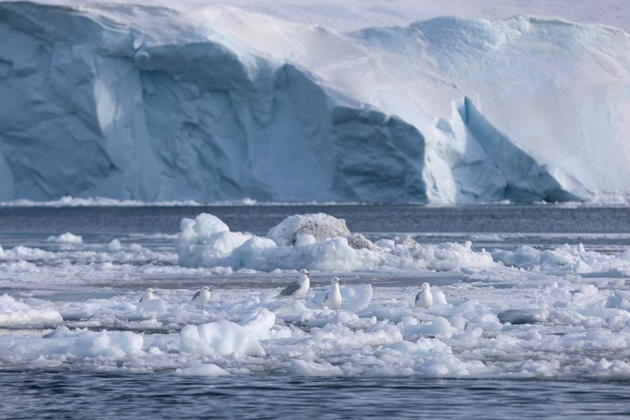 Seagulls perch on the floating ice at the Disko Bay close to Ilulissat, Greenland, an autonomous territory of Denmark, March 22, 2025. (Xinhua/Zhao Dingzhe)