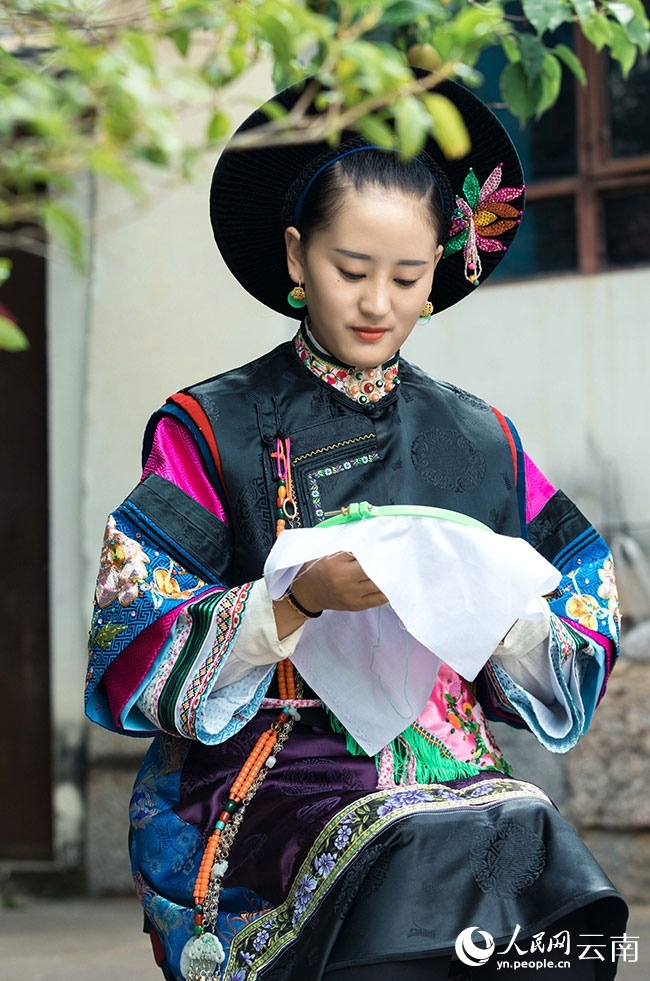 The embroidery tradition, known for children's items and wedding attire, follows specific customs. For Bai ethnic weddings, the groom's family provides the primary outfit, relatives contribute additional pieces and the bride's family completes the ensemble with accessories. The predominantly black garments feature colorful accents and distinctive elements, including a round hat.