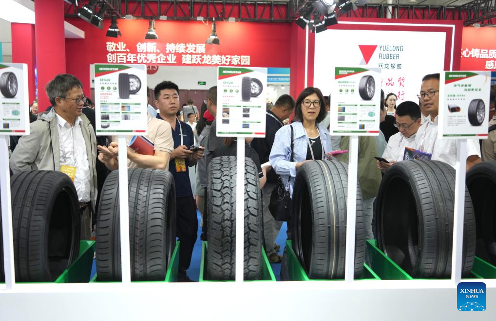People visit the 15th China (Guangrao) International Rubber Tire & Auto Accessory Exhibition in Dongying City, east China's Shandong Province, May 15, 2025. The exhibition kicked off here on Thursday, showcasing cutting-edge technologies and innovative products across the rubber tire industry.