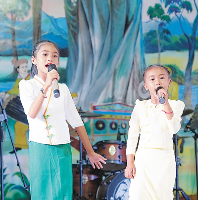 Students of China and Myanmar from a primary school sing a song during a cultural exchange activity in Yinjing village, Dehong Dai and Jingpo Autonomous Prefecture, southwest China's Yunnan Province. (Photo/Kong Yongqin)
