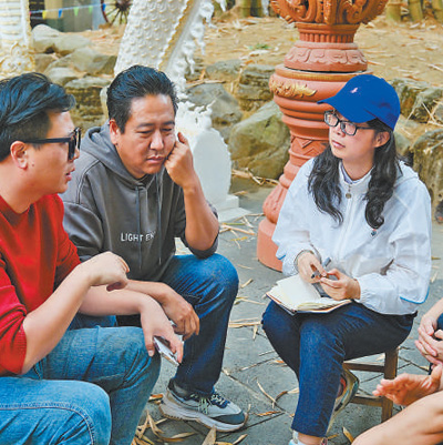 Members of Mengba Naxi band have an interview with People's Daily. (People's Daily Online/Zhuang Zhibin)