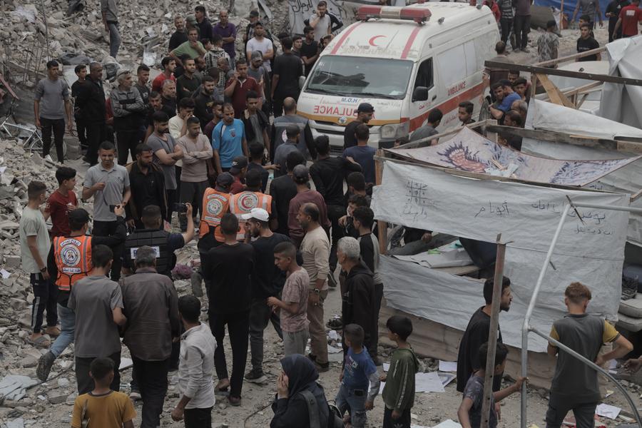 Palestinians inspect a site of an Israeli airstrike in Jabalia refugee camp in northern Gaza Strip, on May 15, 2025. (Photo by Abdul Rahman Salama/Xinhua)