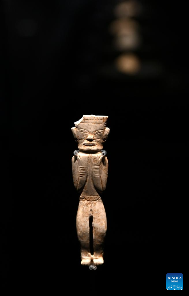 This photo taken on May 16, 2025 shows a jade figurine on display at the Lingjiatan Site Museum in Hanshan County, Ma'anshan City of east China's Anhui Province. (Xinhua/Huang Bohan)