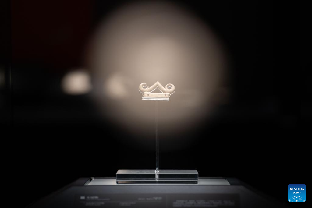 This photo taken on May 16, 2025 shows a jade accessory in crown shape on display at the Lingjiatan Site Museum in Hanshan County, Ma'anshan City of east China's Anhui Province. (Xinhua/Zhang Duan)