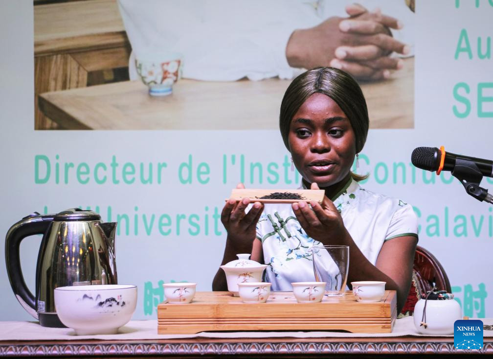 A student from the Confucius Institute demonstrates Chinese tea art at the Chinese Cultural Center in Cotonou, Benin, May 15, 2025.(Photo by Seraphin Zounyekpe/Xinhua)