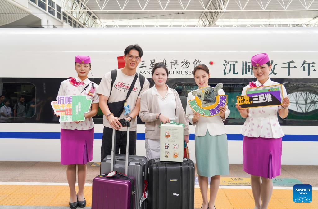 The train takes 18 minutes to reach the Sanxingdui Ruins and around two hours to reach Jiuzhai Valley, two of Sichuan's most prominent attractions. It operates daily with 13 round trips and is expected to carry about 30,000 passengers per day. (China Railway Chengdu Group Co., Ltd./Handout via Xinhua)