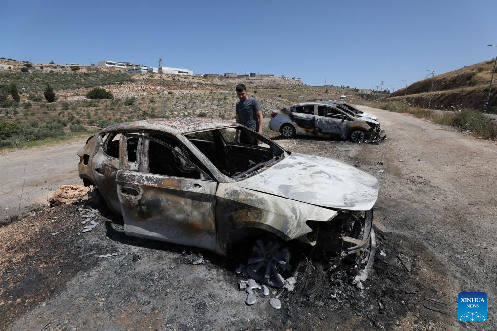 A Palestinian checks cars burned by Israeli settlers near the West Bank city of Salfit, May 16, 2025. (Photo by Nidal Eshtayeh/Xinhua)