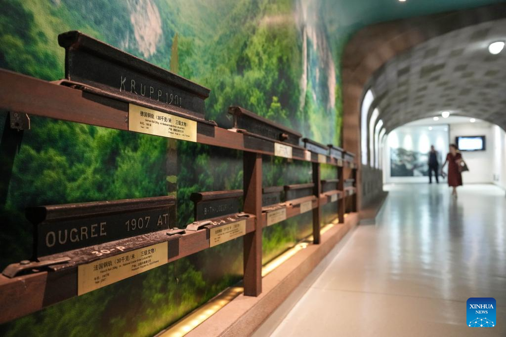 Samples of different railway tracks are pictured at Yunnan Railway Museum in Kunming, southwest China's Yunnan Province, May 14, 2025. Housed in Kunming North Railway Station, the Yunnan Railway Museum takes the century-long development history of Yunnan railway as the leading story line to narrate the frog-leaping evolution railway gauge standards from meter gauge to inch gauge, and standard gauge, as well as railway technologies from steam locomotives to high-speed rails. (Xinhua/Chen Xinbo)