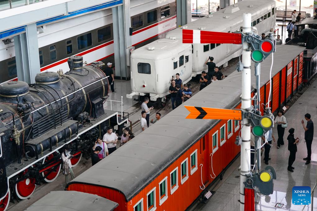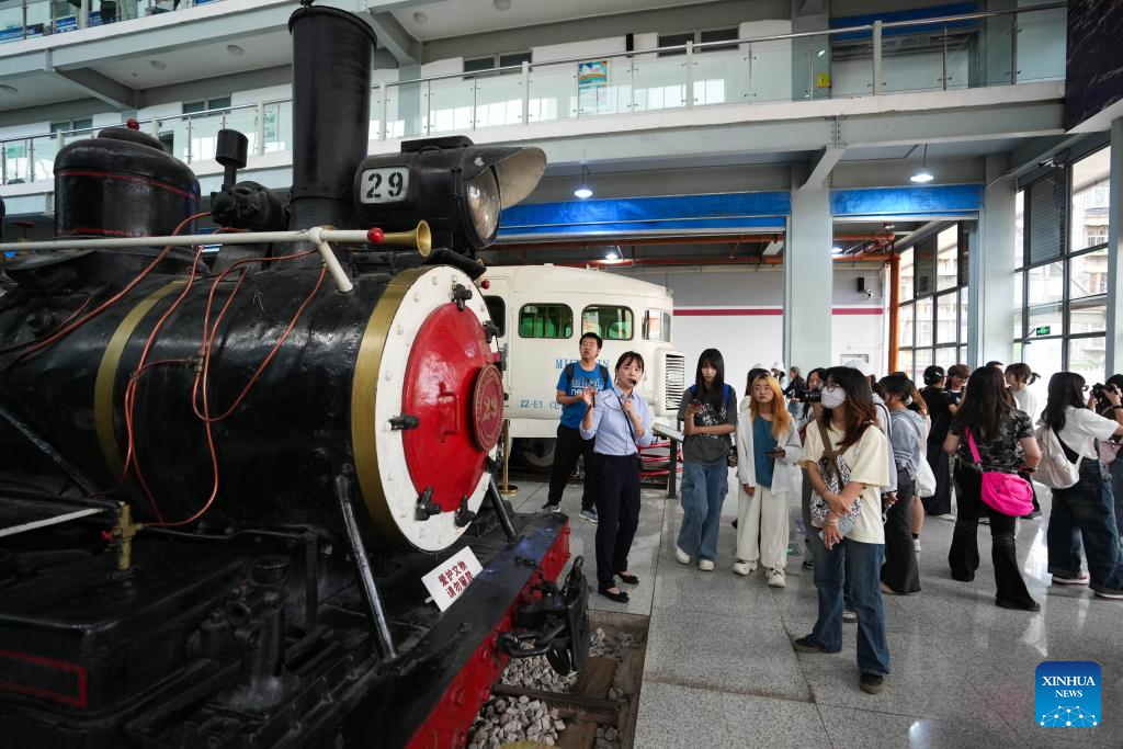 People visit Yunnan Railway Museum in Kunming, southwest China's Yunnan Province, May 16, 2025. Housed in Kunming North Railway Station, the Yunnan Railway Museum takes the century-long development history of Yunnan railway as the leading story line to narrate the frog-leaping evolution railway gauge standards from meter gauge to inch gauge, and standard gauge, as well as railway technologies from steam locomotives to high-speed rails. (Xinhua/Chen Xinbo)